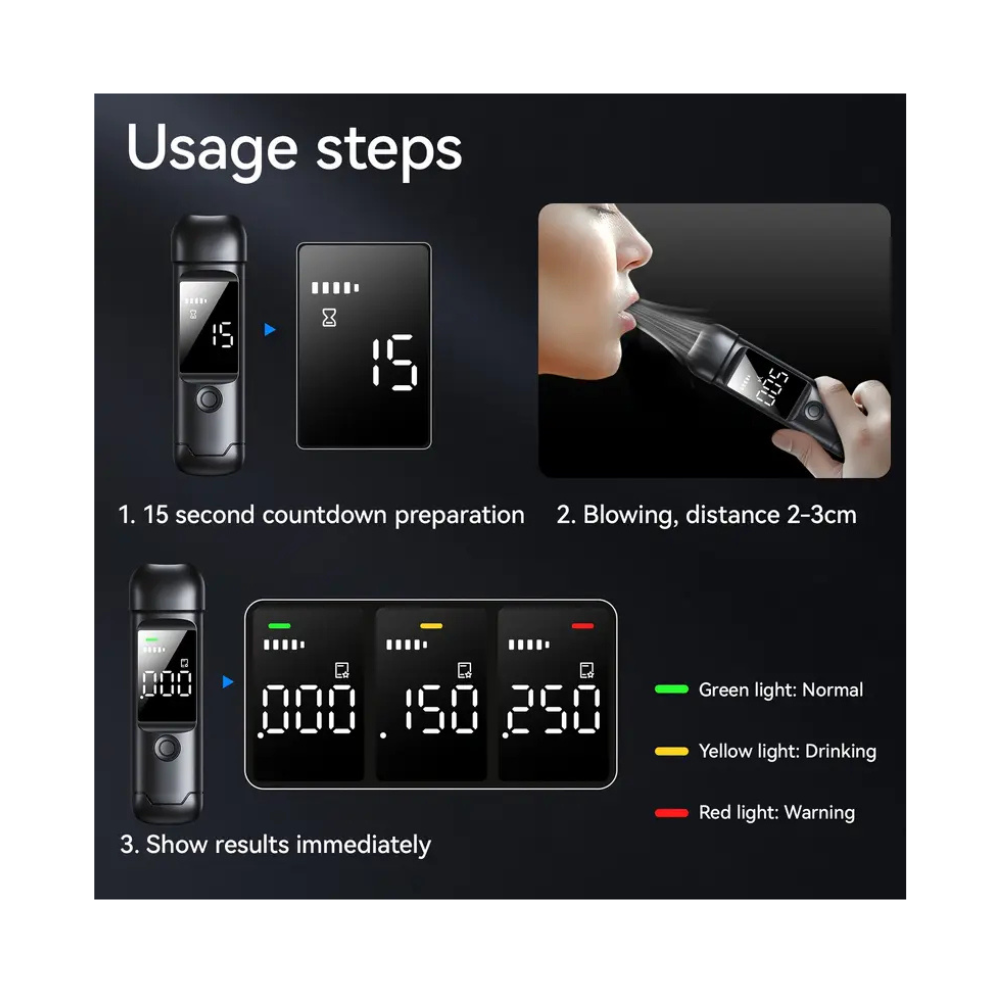 Este alcoholímetro ofrece un test de alcoholemia preciso y confiable, ideal tanto para uso doméstico como profesional. Obtén resultados rápidos y confiables con este alcoholímetro. Realiza un test de alcoholemia en segundos y toma decisiones seguras antes de conducir, perfecto para mantener la tranquilidad y seguridad en la carretera, ligero y fácil de transportar. Su pantalla digital retroiluminada permite leer los resultados claramente, incluso en condiciones de baja iluminación. Ideal para cualquier situación donde se requiera un test de alcoholemia. Equipado con un sensor electroquímico de alta precisión, ofrece lecturas exactas y rápidas, similares a los dispositivos utilizados por las fuerzas de seguridad. Asegura un control de alcoholemia fiable en cualquier momento.