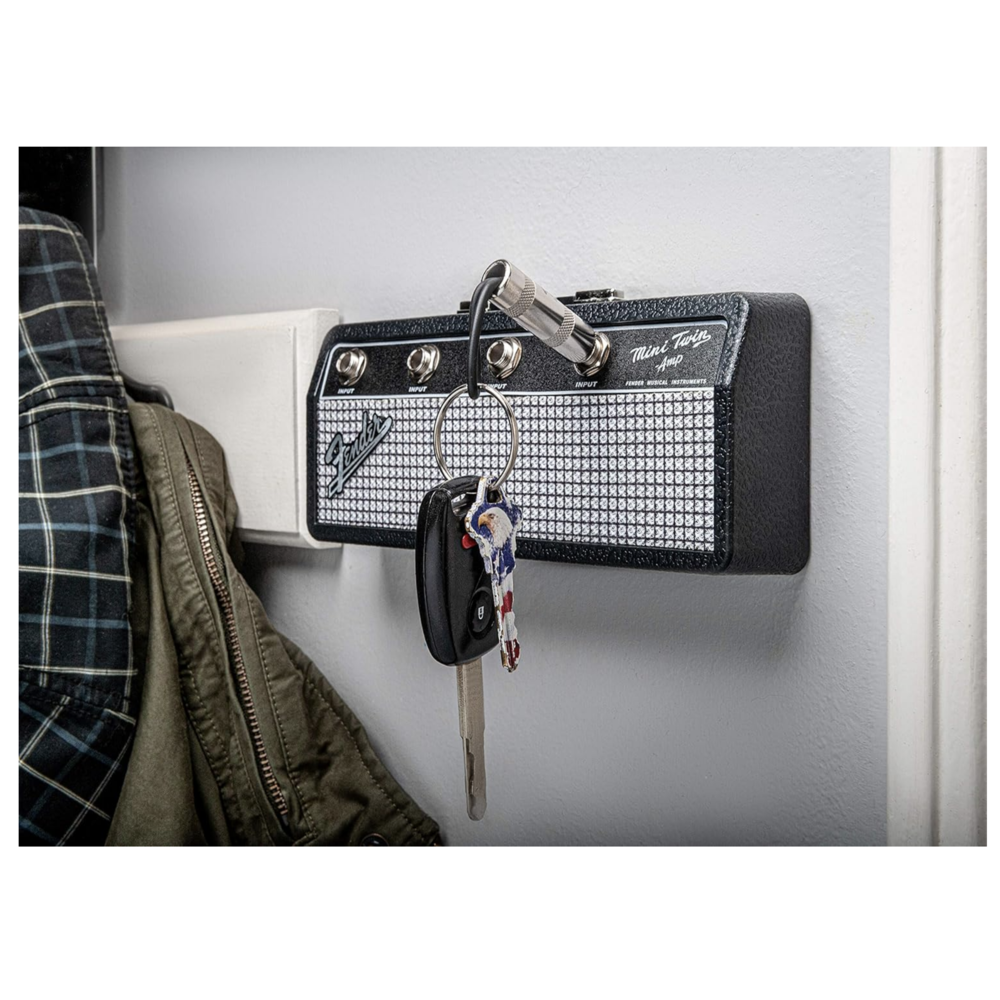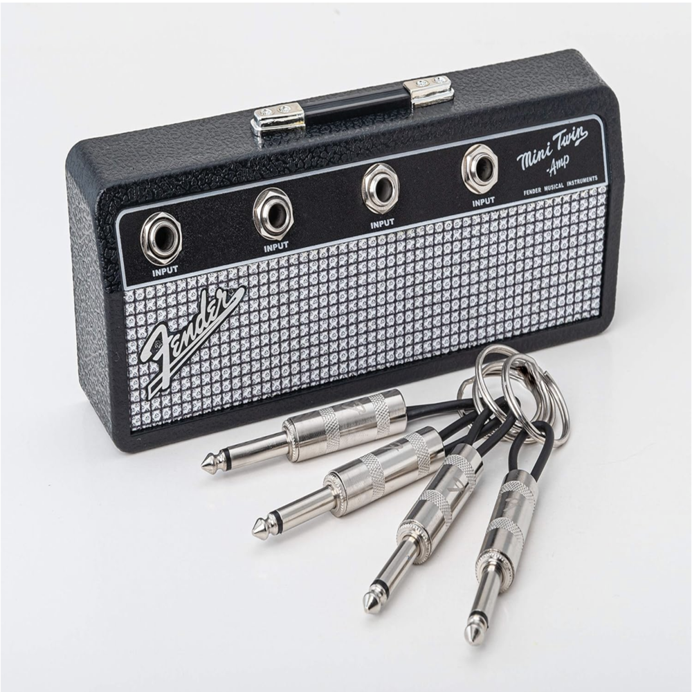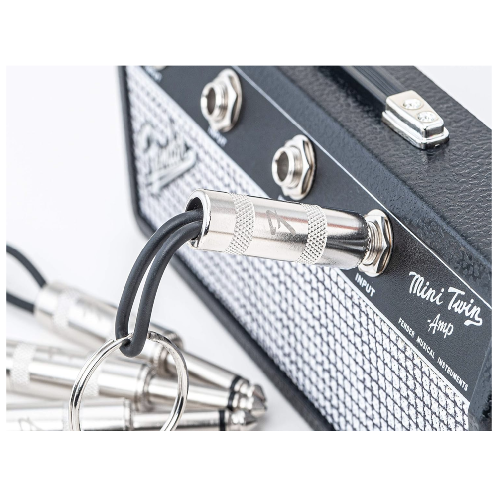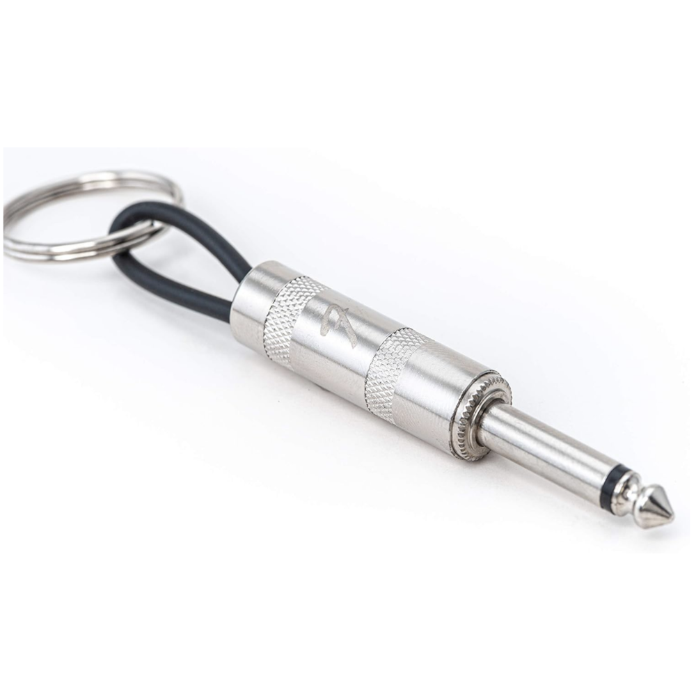4 llaveros con enchufe de guitarra, diseñados con el emblemático logotipo Fender.