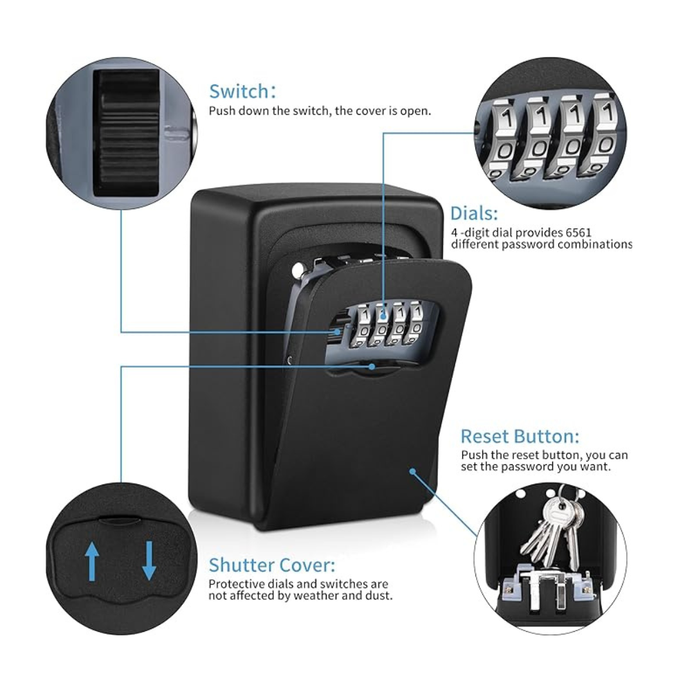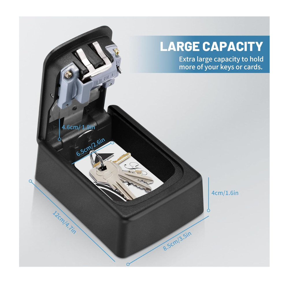 La caja de llaves con código de instalación y uso es muy fácil, hay varios métodos de instalación para que elijas, no requiere energía. Se puede instalar en la entrada de tu hogar, garaje, negocio o en interiores para bloquear objetos pequeños. El espacio de almacenamiento de la caja de bloqueo de llaves se ha actualizado, se pueden colocar al menos 5 llaves de casa, también puedes almacenar temporalmente llaves de automóvil pequeñas, documentos y otros artículos pequeños.