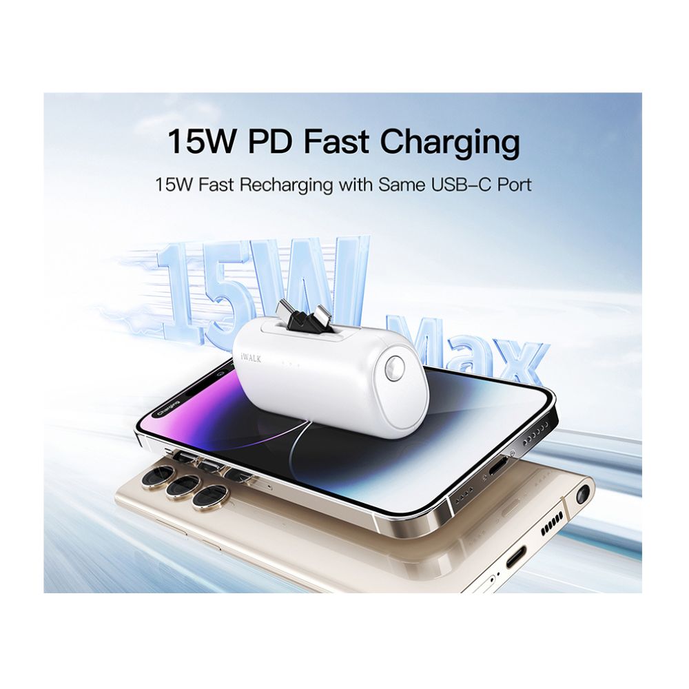 📲Cargador portátil iWALK para iPhone con conector 2 en 1, batería externa pequeña de 5000 mAh, carga rápida compatible con iPhone, Samsung S25/24 y Android.