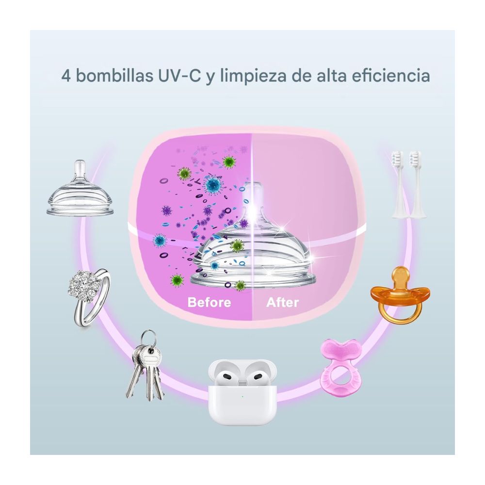 👶 Con 4 bombillas UV-C libres de ozono y sin mercurio, proporciona un 99% de desinfección completa para el chupete de tu bebé. Para proteger tus ojos y piel de la exposición a los rayos UV, la luz UV-C está diseñada para apagarse automáticamente cuando se abre la tapa.