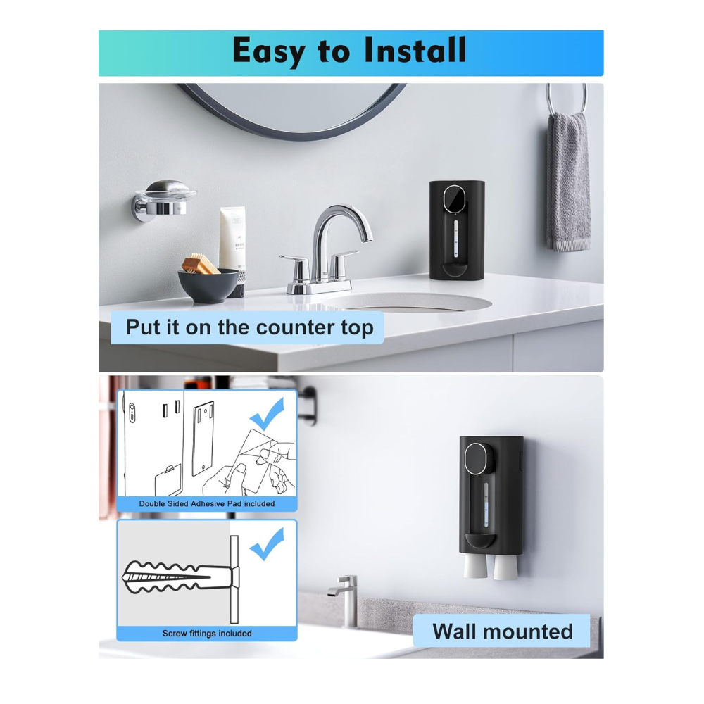 ✨【Fácil de instalar】Rápido y fácil de instalar con almohadilla autoadhesiva incluida o accesorios de tornillo. Way1: Pegue el soporte con adhesivo a una pared limpia y espere 48 horas, luego cuelgue el dispositivo en el soporte y asegúrese de que la hebilla en el medio del soporte esté insertada en la ranura en la parte posterior del dispositivo. Nota: De esta manera no es adecuado para paredes de pintura, paredes de cal y papel tapiz. Way2: Fije el soporte en la pared con tornillos, luego cuelgue el dispensador de enjuague bucal en el soporte. También puedes simplemente sentarlo en el mostrador.
