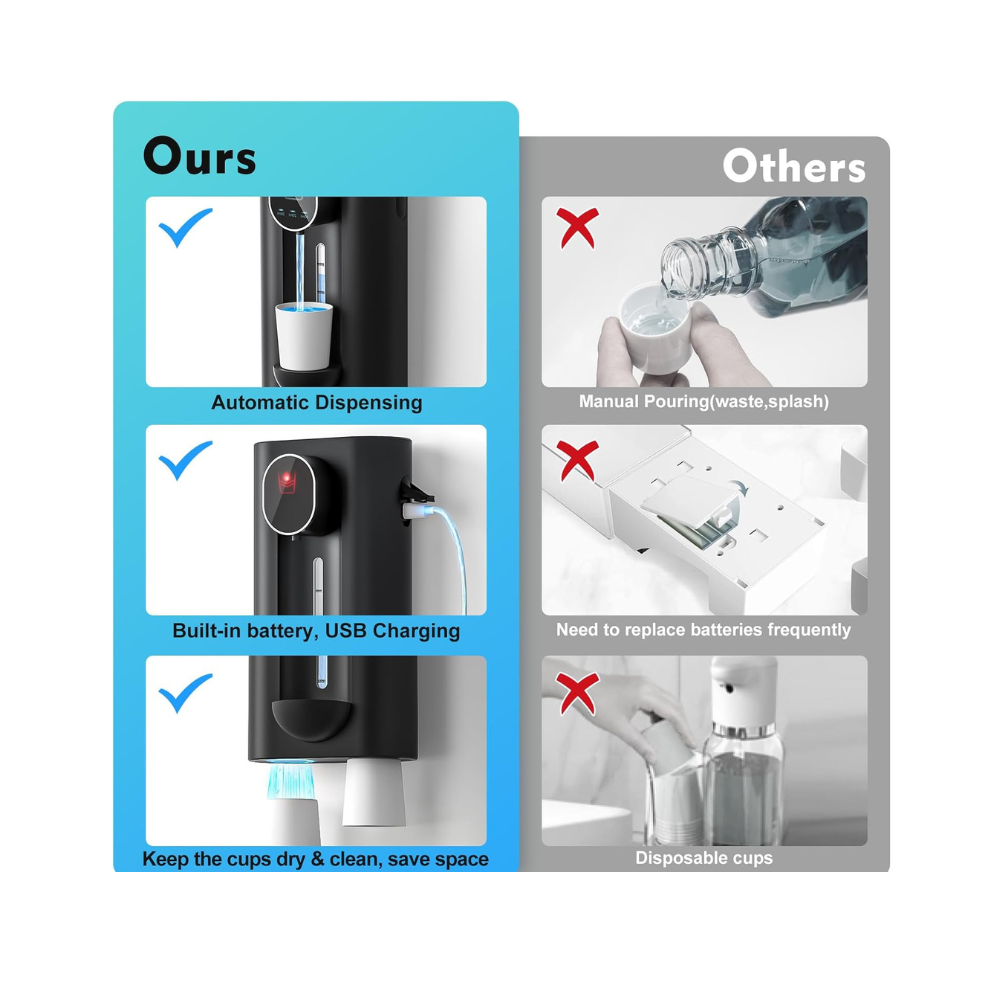 ✨Dispensador de enjuague bucal recargable por USB: en comparación con otros dispensadores de enjuague bucal automático en el mercado, lo fabricamos con batería integrada de 1200 mAh en lugar de la batería AAA. Nuestro producto es más conveniente y rentable, 1.5 horas de soporte de carga 180 días en espera. Deja de perder tiempo y dinero en reemplazar las baterías AAA.