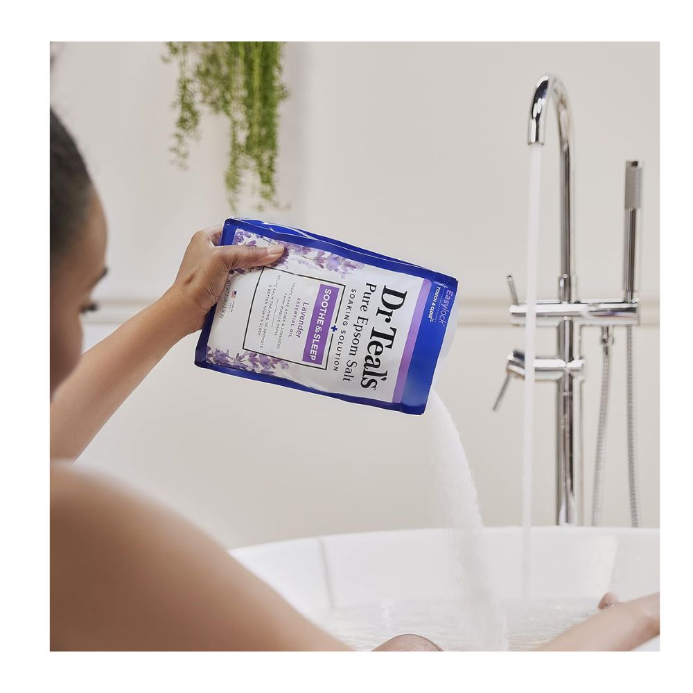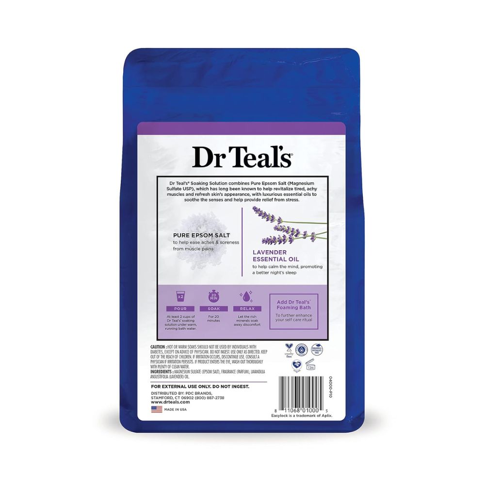 La Solución de remojo de Dr Teal’s® combina sal de Epsom pura (sulfato de magnesio, USP), la cual se sabe desde hace mucho tiempo que revitaliza los músculos cansados y doloridos, y refresca la apariencia de la piel, con lujosos aceites esenciales para calmar los sentidos y ayudar a aliviar el estrés.