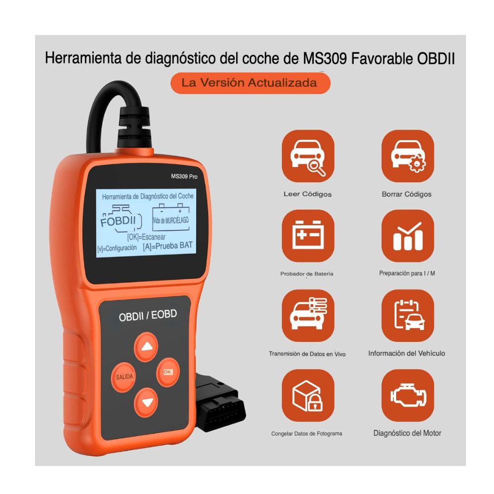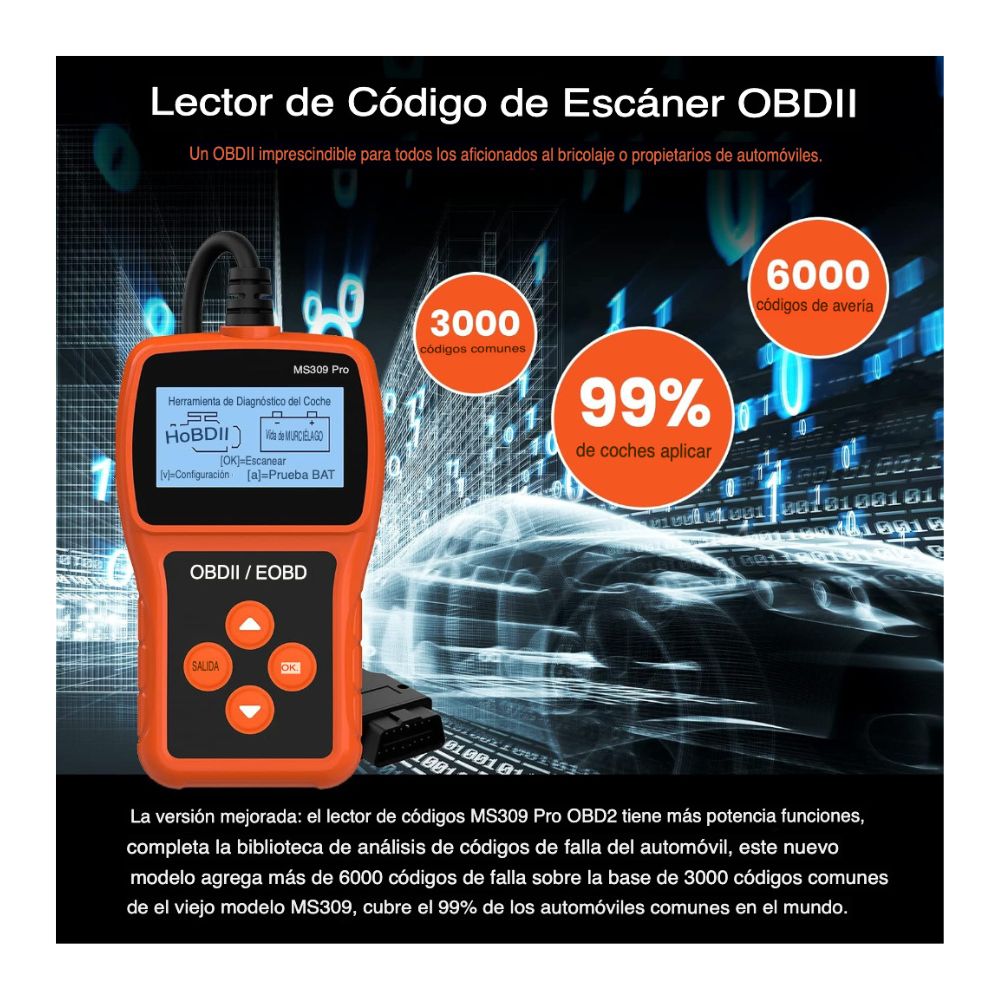 🚘Nuestro escáner cuenta con un potente rendimiento es la versión mejorada el lector de código MS309 Pro OBD2 tiene funciones más potentes, pleta la biblioteca de análisis de códigos de fallo del coche, e nuevo modelo añade más de 6000 códigos de fallo sobre la base de 3000 códigos unes del modelo antiguo MS309, cubre el 99% de los automóviles comunes en el mundo. Un OBDII imprescindible todos los aficionados o propietarios de coches.
