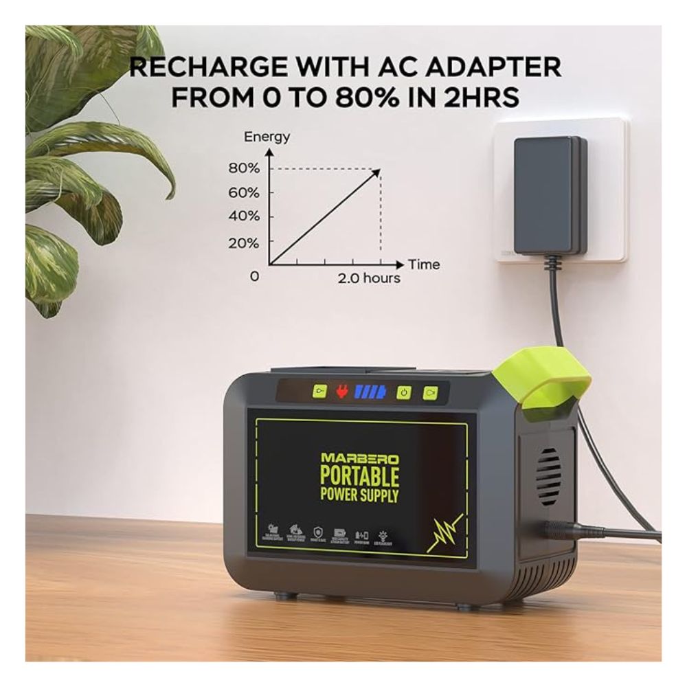• Carga eficiente: Utiliza el adaptador incluido en el paquete para cargar la estación de 0 a 80% en 2hrs, y utiliza esta fuente de alimentación para cargar otros dispositivos al mismo tiempo mientras se carga, lo que podría ser equivalente a una regleta de carga , mejorando la eficiencia de los usos. Se puede cargar de manera eficiente con el panel solar especializado de MARBERO de 30 W o 60 W, adecuado para acampar al aire libre o en el patio trasero.