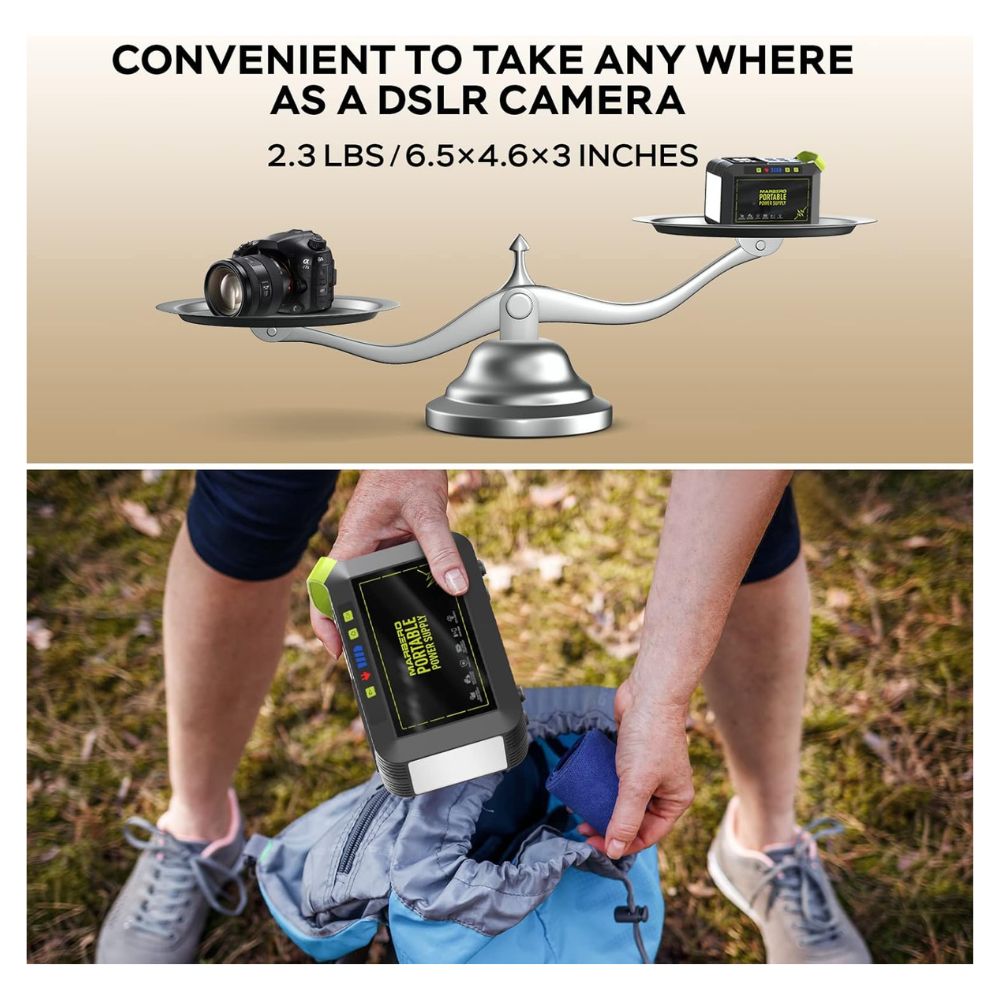 • Diseño compacto y portátil: Tamaño muy delgado (6.5 x 4.6 x 3.1 pulgadas), la estación de energía portátil es aproximadamente del tamaño de una cámara réflex digital básica; la caja de plástico es fuerte pero ligera (3.2 libras), además de un mango ergonómico, es muy adecuada para acampar al aire libre, viajes por carretera, campamento en el patio trasero, hogar, escuela, oficina, etc.