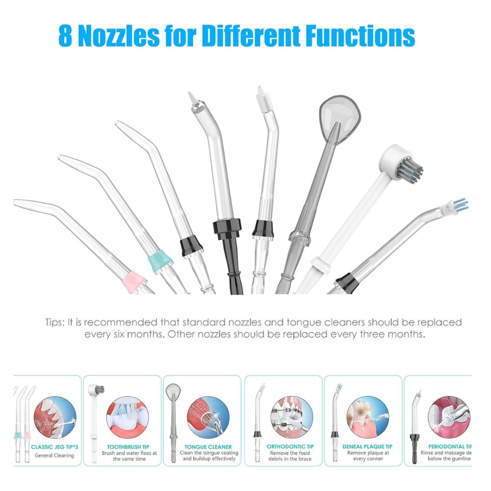 - 🦷 Tipos de puntas únicas: tiene 3 puntas de alta presión ordinarias y 5 puntas de boquilla únicas, satisfaciendo diversas necesidades de cuidado dental bucal. El cabezal de la boquilla se puede girar 360° para llegar a todas las áreas de la boca para limpiar a fondo los restos de comida entre los dientes y las encías.