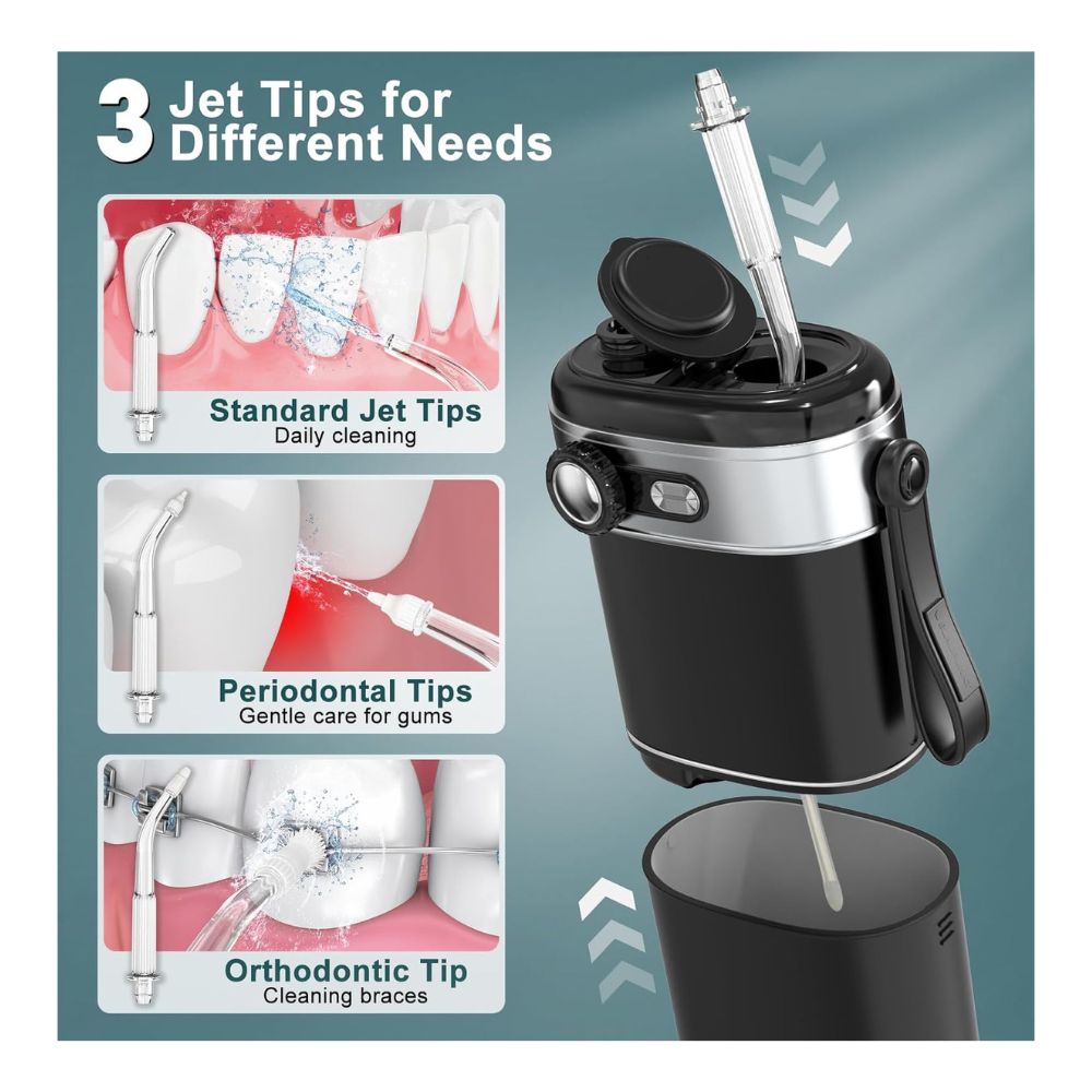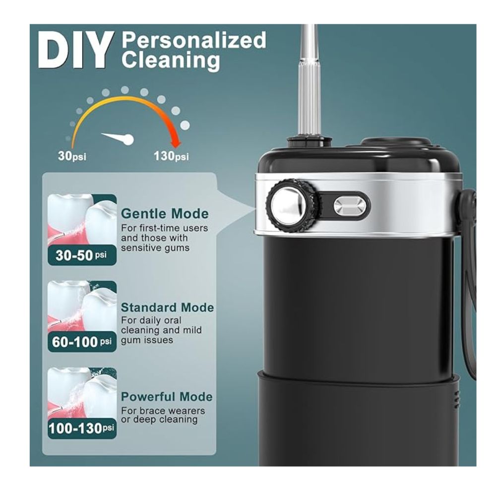 Personaliza tu modo de cuidado bucal: Nuestros irrigadores bucales cuentan con modos únicos de perilla infinita, diferentes del modo fijo de otros productos. Gira la perilla hacia la izquierda o hacia la derecha para ajustar la presión del agua de 200 a 2300 pulsaciones por minuto. Esta perilla garantiza una experiencia de limpieza personalizada, ya sea que necesites un cuidado suave para encías sensibles o una limpieza profunda para caries profundas.