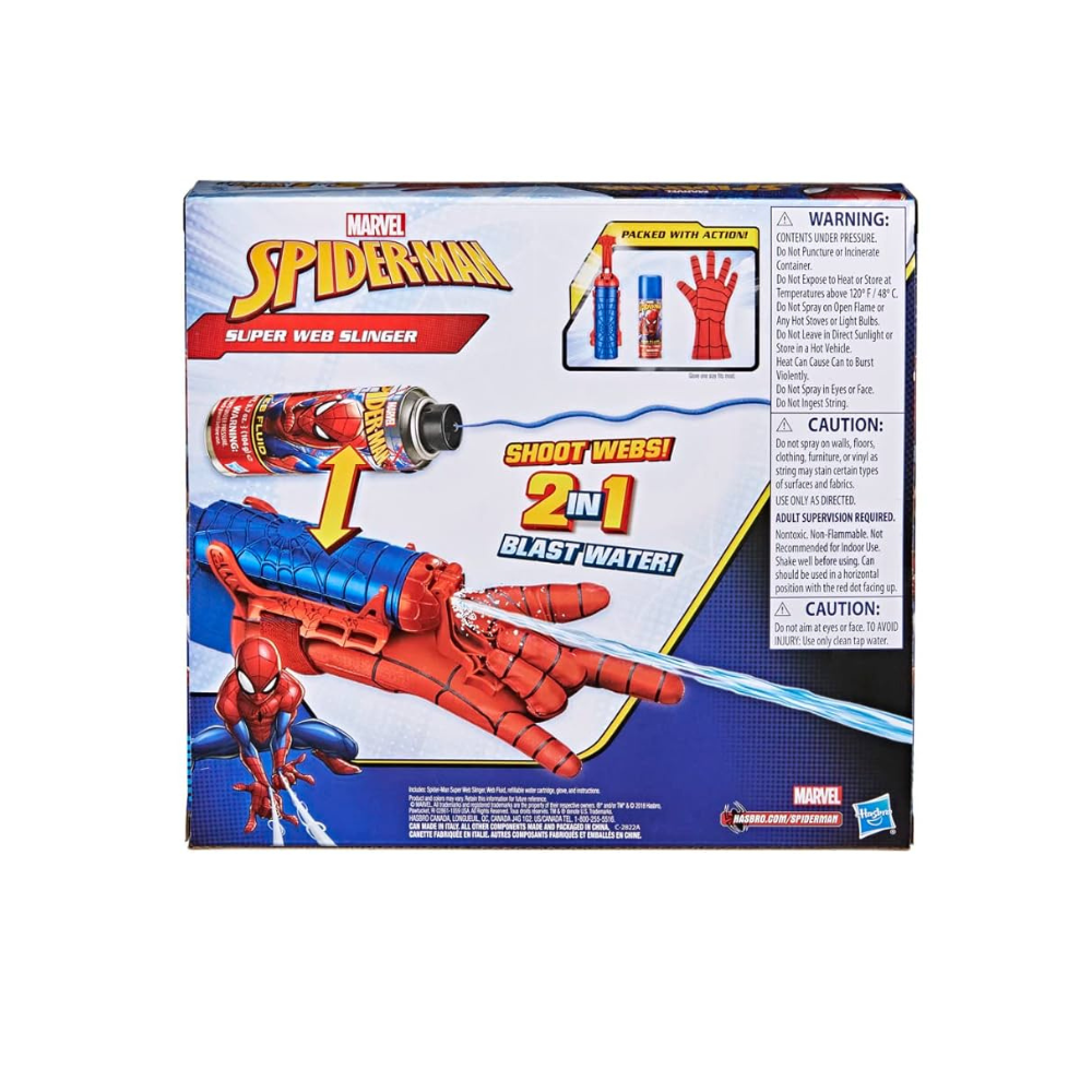 🕸️Con el Spider-Man Super Web Slinger, los niños están listos para balancear telarañas como Spider-Man. Carga la lata incluida de Spidey Shot web fluido y prepárate para una acción de explosión de telaraña. Los niños descubrirán que balancearse en la telaraña no es solo una gran manera de imaginar la lucha contra el crimen, sino que también es una gran manera de divertirse Con el Spider-Man Super Web Slinger, es hora de disparar a los chicos malos o simplemente divertirse con el equipo de Spider-Man. Derechos de autor 2016 Marvel. Hasbro y todos los términos relacionados son marcas comerciales de Hasbro.