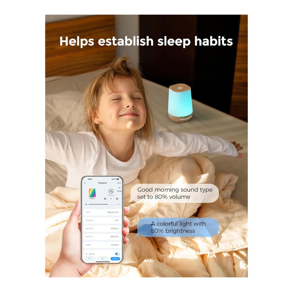 Cada familia tiene su propio ritmo, y esta máquina de sonido lo reconoce. Adapta el brillo, el color, la intensidad del ruido blanco y el volumen para que se adapten con precisión al ambiente de tu hogar. Además, con la programación automática, los sonidos y las luces que elijas se sincronizarán fácilmente con el ciclo de sueño de tu familia.