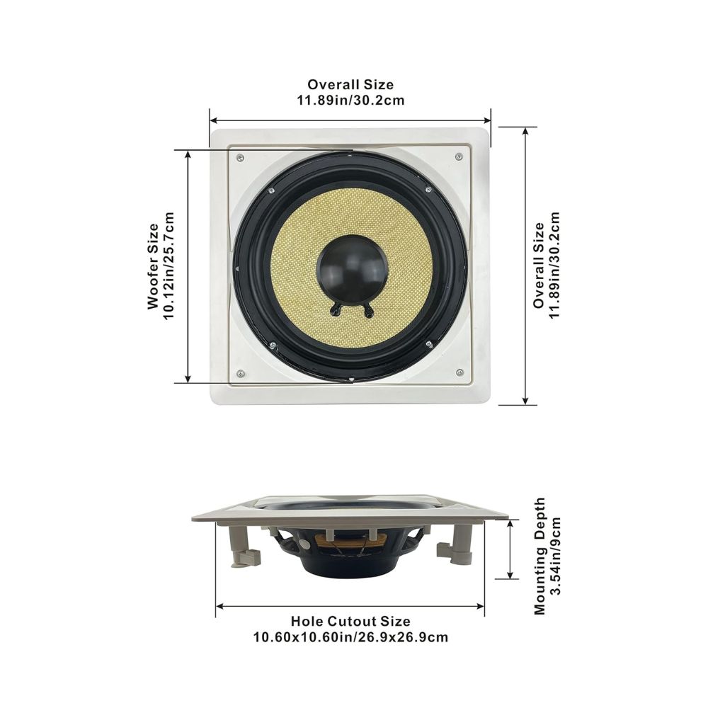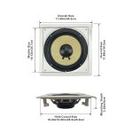 Fácil de instalar: el sistema de montaje de bloqueo de presión se sujeta firmemente al panel de yeso, se adapta a orificios de altavoz cuadrados de 10.6 x 10.6 pulgadas con una profundidad de montaje de 3.54 pulgadas, tamaño total de 11.89 x 11.89 pulgadas con conexiones de cable sin procesar cargadas por resorte, carcasa ABS duradera y parrilla se pueden pintar para que coincida con tu decoración