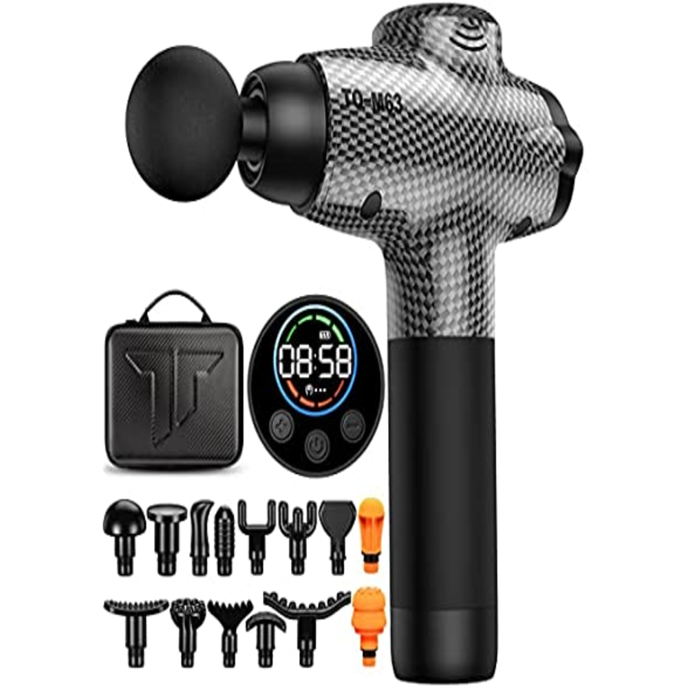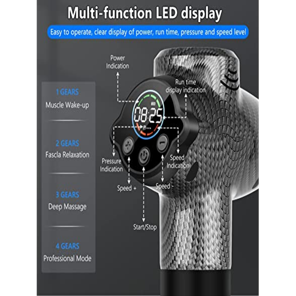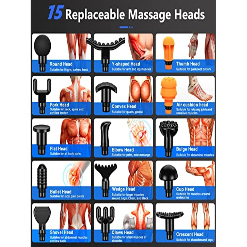 • Pistola de masaje muscular, 15 cabezales de masaje reemplazables ayudan a los usuarios a relajar todas las partes del cuerpo, pantalla LED multifuncional, protección de sincronización